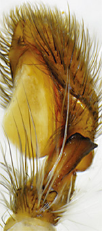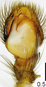 ![]() Fig.: F-31351 Hyllus bisulcus - ♂ - general appearance, dorsal view - © HADDAD, C. R., WIŚNIEWSKI, K. & WESOŁOWSKA, W. (2024) | ![]() Fig.: F-31352 Hyllus bisulcus - ♂ - palpal organ, ventral view - © HADDAD, C. R., WIŚNIEWSKI, K. & WESOŁOWSKA, W. (2024) | ![]() Fig.: F-31353 Hyllus bisulcus - ♂ - palpal organ, ventrolateral view - © HADDAD, C. R., WIŚNIEWSKI, K. & WESOŁOWSKA, W. (2024) |