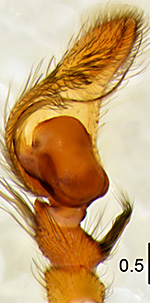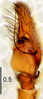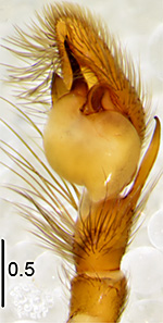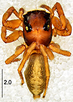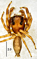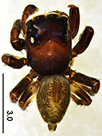 ![]() Fig.: F-34339 Thiratoscirtus cognatus - ♂ - general appearance, dorsal view - © WESOŁOWSKA, W., RUSSELL-SMITH, A. & DANFLOUS, S. (2026) | ![]() Fig.: F-34340 Thiratoscirtus cognatus - ♂ - left pedipalp, ventral view. Scale bar: 0.5 mm - © WESOŁOWSKA, W., RUSSELL-SMITH, A. & DANFLOUS, S. (2026) | ![]() Fig.: F-34341 Thiratoscirtus cognatus - ♂ - left pedipalp, retrolateral view. Scale bar: 0.5 mm - © WESOŁOWSKA, W., RUSSELL-SMITH, A. & DANFLOUS, S. (2026) | ![]() Fig.: F-34342 Thiratoscirtus cognatus - ♂ - left pedipalp, dorsal view. Scale bar: 0.5 mm - © WESOŁOWSKA, W., RUSSELL-SMITH, A. & DANFLOUS, S. (2026) | ||||