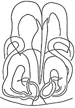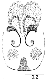 ![]() WESOŁOWSKA, W. & HENRARD, A. (2025)New data on the jumping spiders (Araneae: Salticidae) from the Nimba Mountains, Guinea Ann. Zool., Warszawa 75 (3): 811-912 Bacelarella magnifica - ♀ - epigyne - Guinea HOLOTYPE ![]() WESOŁOWSKA, W. & HENRARD, A. (2025)New data on the jumping spiders (Araneae: Salticidae) from the Nimba Mountains, Guinea Ann. Zool., Warszawa 75 (3): 811-912 Bacelarella magnifica - ♀ - internal structure of epigyne, ventral view - Guinea HOLOTYPE ![]() WESOŁOWSKA, W. & HENRARD, A. (2025)New data on the jumping spiders (Araneae: Salticidae) from the Nimba Mountains, Guinea Ann. Zool., Warszawa 75 (3): 811-912 Bacelarella magnifica - ♀ - internal structure of epigyne, dorsal view - Guinea HOLOTYPE |