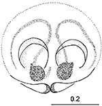 ![]() WESOŁOWSKA, W. & HENRARD, A. (2025)New data on the jumping spiders (Araneae: Salticidae) from the Nimba Mountains, Guinea Ann. Zool., Warszawa 75 (3): 811-912 Detalik solitarius - ♀ - epigyne - Guinea HOLOTYPE ![]() WESOŁOWSKA, W. & HENRARD, A. (2025)New data on the jumping spiders (Araneae: Salticidae) from the Nimba Mountains, Guinea Ann. Zool., Warszawa 75 (3): 811-912 Detalik solitarius - ♀ - vulva - Guinea HOLOTYPE |