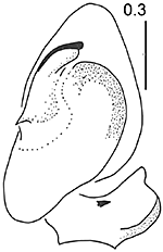 ![]() WESOŁOWSKA, W. & HENRARD, A. (2025)New data on the jumping spiders (Araneae: Salticidae) from the Nimba Mountains, Guinea Ann. Zool., Warszawa 75 (3): 811-912 Menemerus lobarus - ♂ - palpal organ, ventral view - Guinea HOLOTYPE ![]() WESOŁOWSKA, W. & HENRARD, A. (2025)New data on the jumping spiders (Araneae: Salticidae) from the Nimba Mountains, Guinea Ann. Zool., Warszawa 75 (3): 811-912 Menemerus lobarus - ♂ - palpal organ, lateral view - Guinea HOLOTYPE |