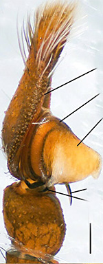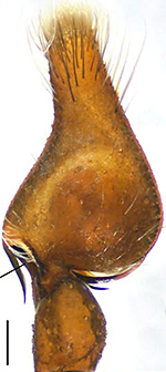 Fig.: F-34194 Epeus taybac - ♂ - left palp, dorsal view. Scale bar: 0.1 mm - Vietnam HOLOTYPE