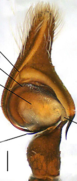 Fig.: F-34193 Epeus taybac - ♂ - left palp, retrolateral view. Scale bar: 0.1 mm - Vietnam HOLOTYPE